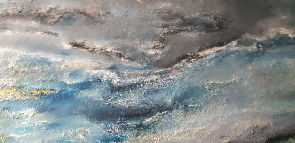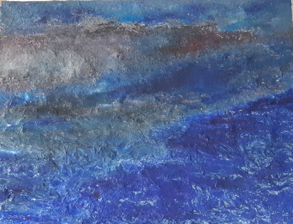 Bleus… primaires… outremers… cobalt… et noirs… et cette encre… cette huile… ces mélanges… je ne sais pas où je vais… Océans? Nuages? Infinis?… A vous de choisir… vous êtes libres!